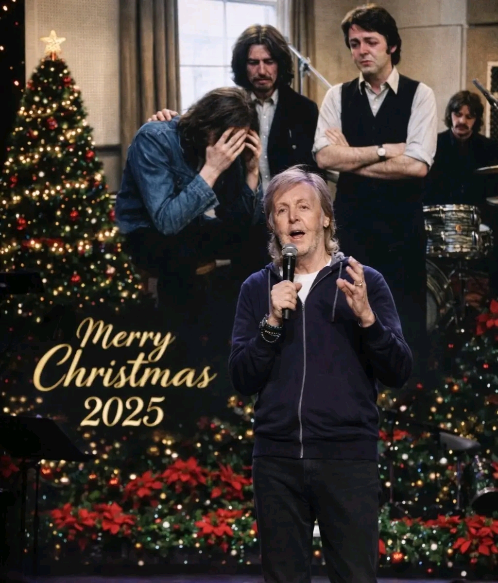 Christmas 2025 was meant to be a season of warmth, reflection, and familiar celebration. Instead, it became something far rarer—a moment when music history paused, looked back at itself, and quietly admitted the truth it had spent decades protecting. On that night, Paul McCartney stunned the world by honoring John Lennon and George Harrison in a way no one expected: not with polished tributes or carefully framed nostalgia, but with unseen Beatles footage projected onto a massive LED screen, revealing the band’s raw emotional collapse during the recording of their final song.